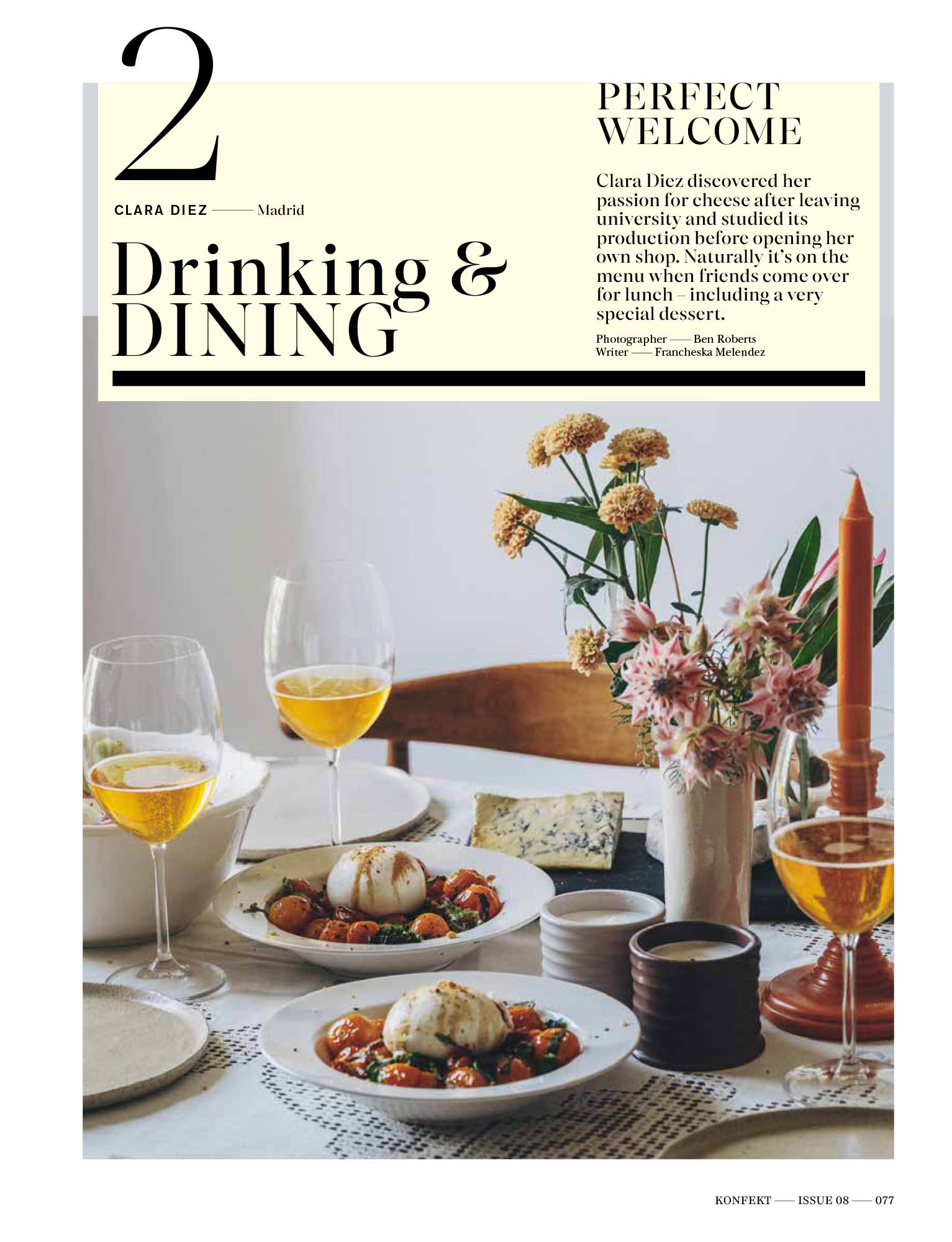 Back Konfekt | Perfect Welcome: Clara Diez, Autumn 2022 Experience the hosting style of one of Madrid’s most charming cheese activists. Journalism Branded Content Essays Books Audio